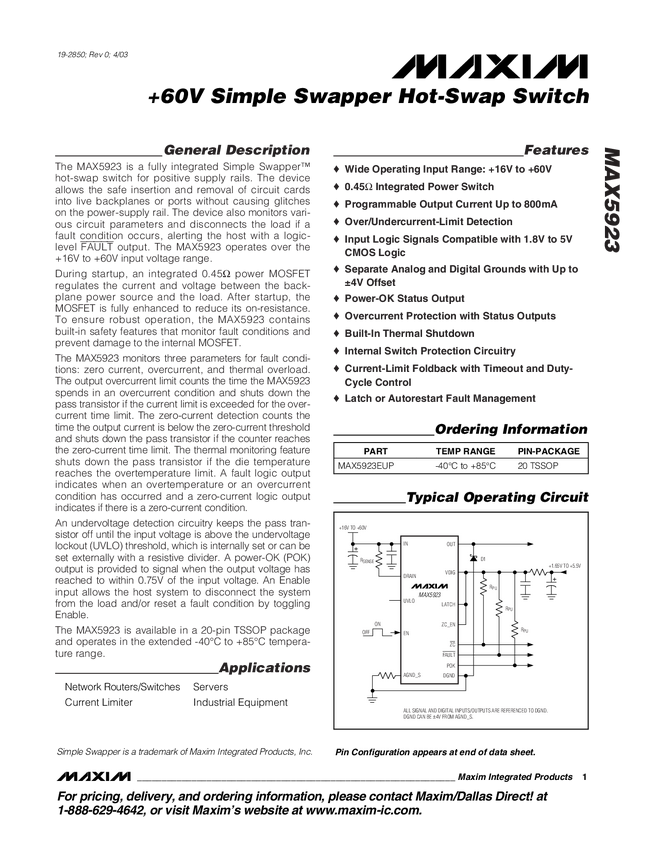 MAX5923 +60V Simple Swapper Hot-Swap Switch