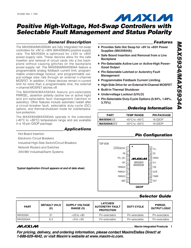 MAX5934 Positive High-Voltage, Hot-Swap Controllers with Selectable Fault Managemen...