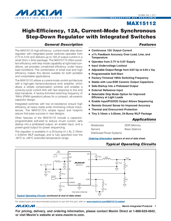 MAX15112 High-Efficiency, 12A, Current-Mode Synchronous Step-Down Regulator with Int...