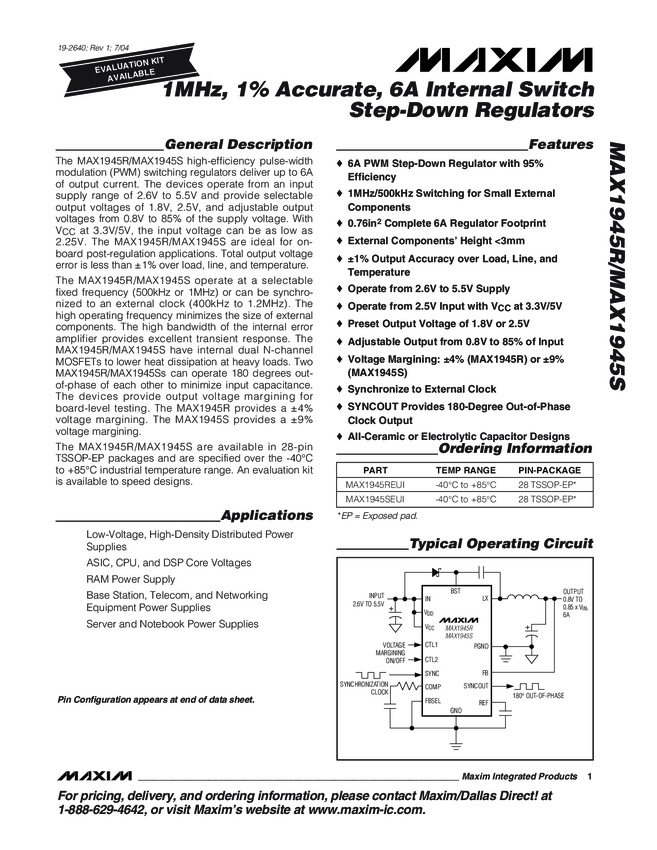 MAX1945 1MHz, 1% Accurate, 6A Internal Switch Step-Down Regulators