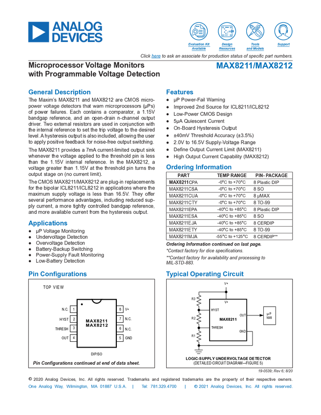 MAX8212 Microprocessor Voltage Monitors with Programmable Voltage Detection