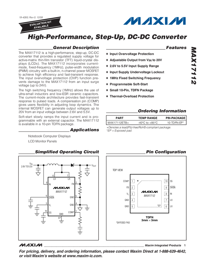 MAX17112 High-Performance, Step-Up, DC-DC Converter