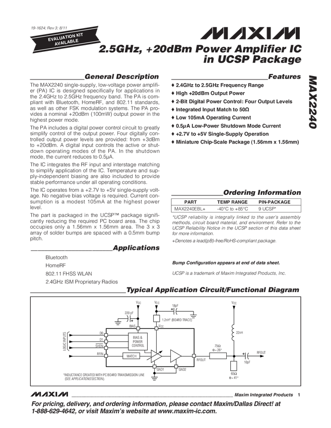 MAX2240 2.5GHz, +20dBm Power Amplifier IC in UCSP Package