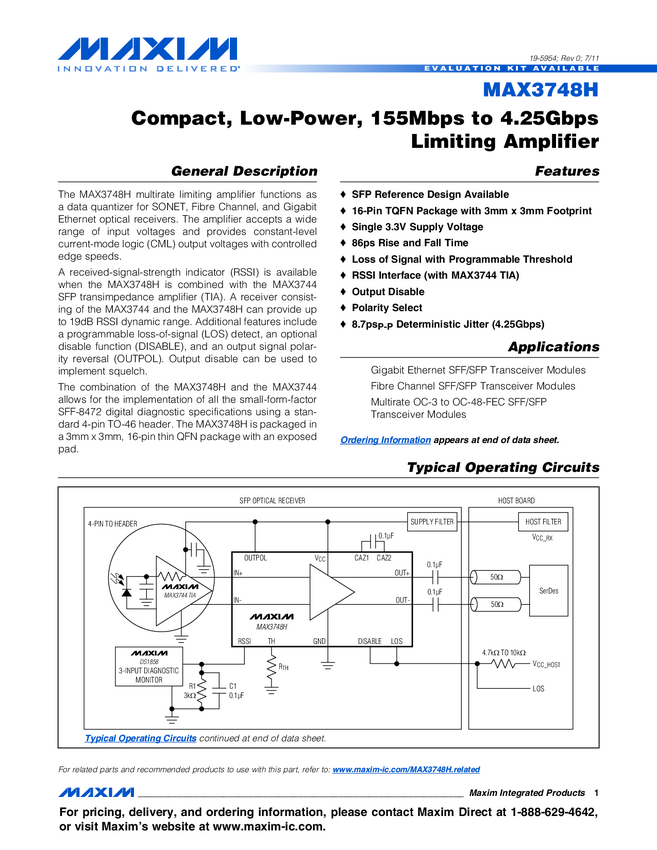 MAX3748H Compact, Low-Power, 155Mbps to 4.25Gbps Limiting Amplifier
