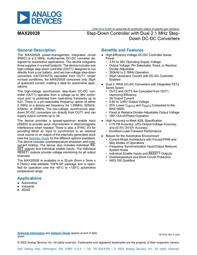 MAX20028 Step-Down Controller with Dual 2.1MHz Step-Down DC-DC Converters