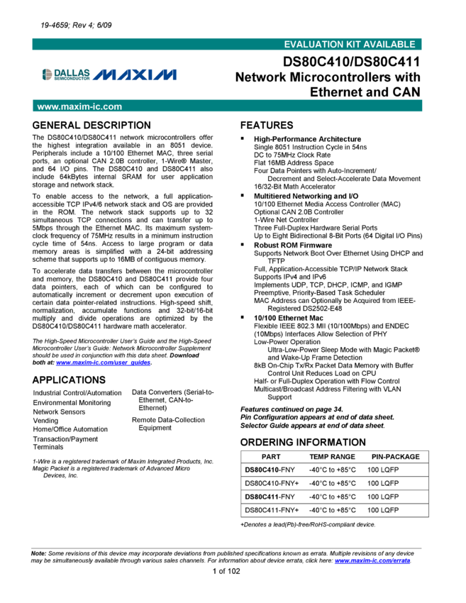 DS80C410, DS80C411 Network Microcontrollers with Ethernet and CAN