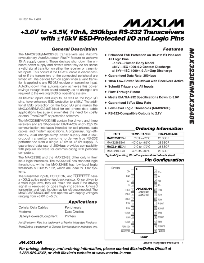 +3.0V to +5.5V, 10nA, 250kbps RS-232 Transceivers with ±15kV ESD-Protected I/O and Logic Pins