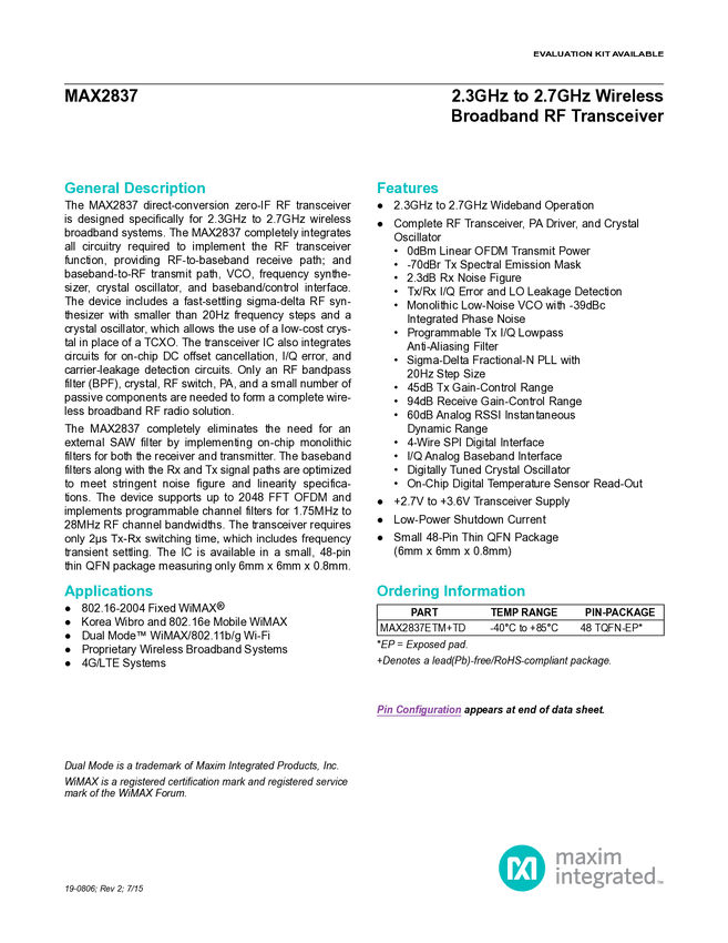 MAX2837 2.3GHz to 2.7GHz Wireless Broadband RF Transceiver