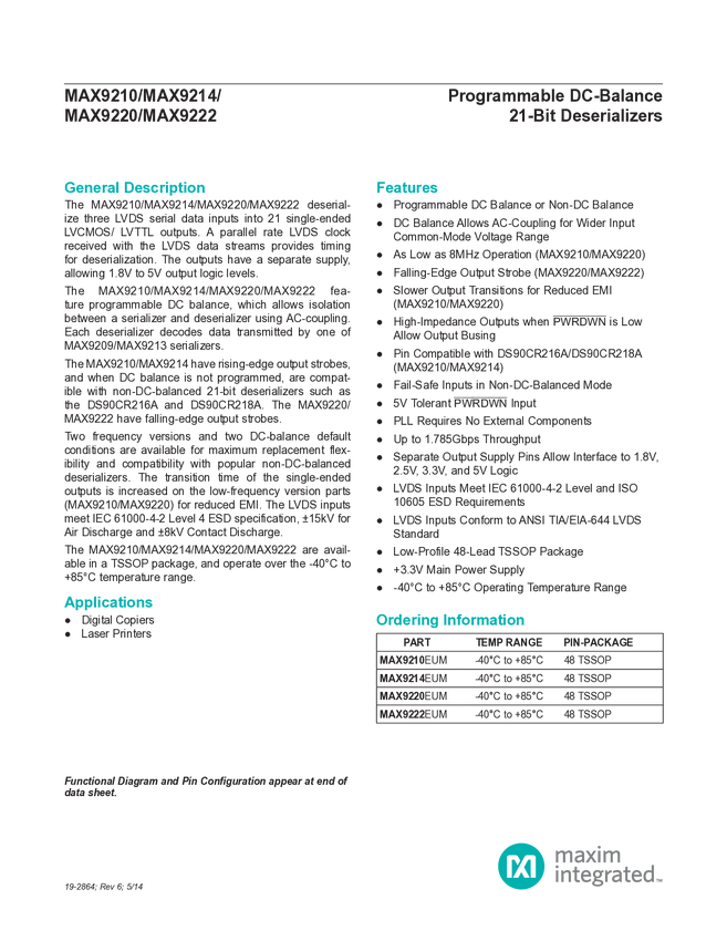 MAX9214 Programmable DC-Balance 21-Bit Deserializers