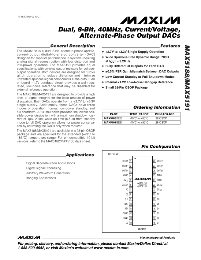 MAX5188 Dual, 8-Bit, 40MHz, Current/Voltage, Alternate-Phase Output DACs