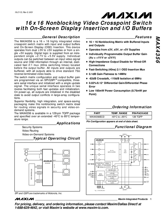 MAX4356 16 x 16 Nonblocking Video Crosspoint Switch with On-Screen Display Insertio...