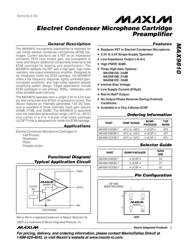 MAX9810C Electret Condenser Microphone Cartridge Preamplifier