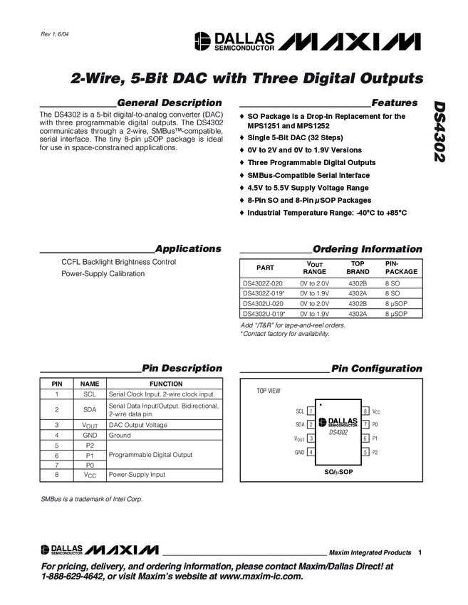DS4302 2-Wire, 5-Bit DAC with Three Digital Outputs