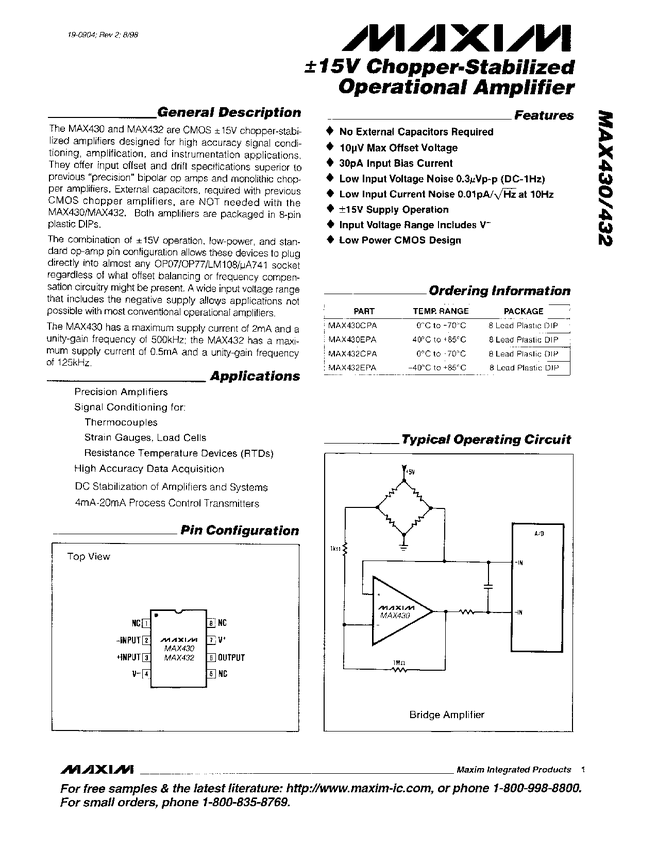 MAX430 ±15V Chopper Stabilized Operational Amplifier