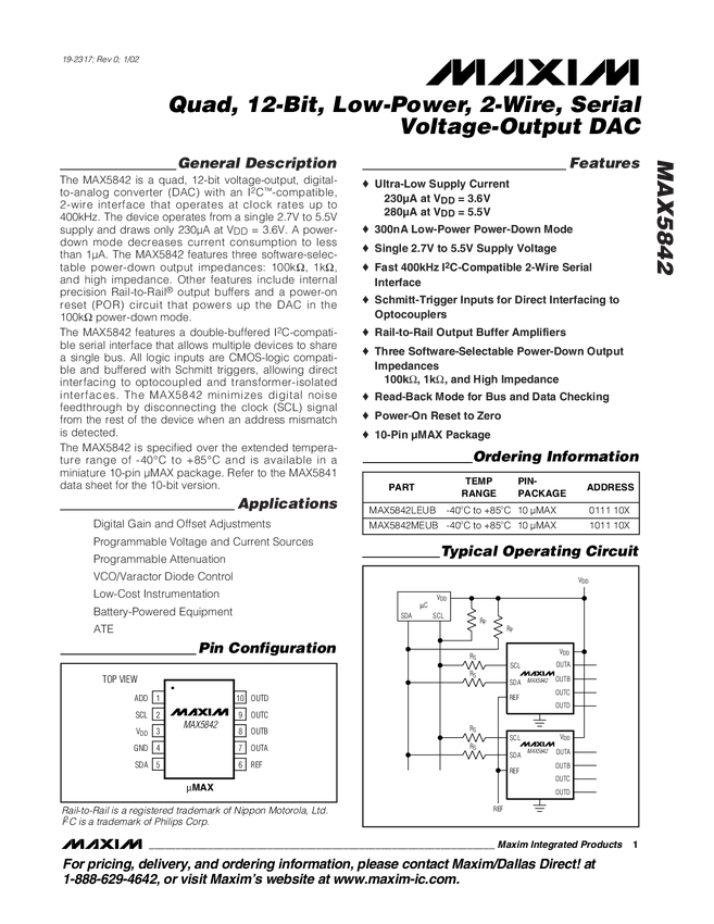 MAX5842 Quad, 12-Bit, Low-Power, 2-Wire, Serial Voltage-Output DAC