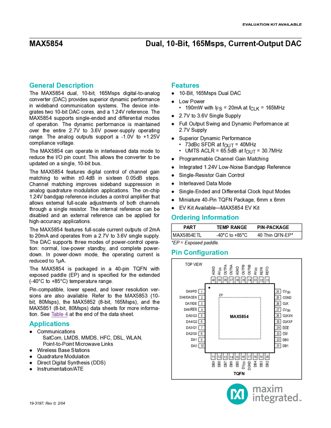 MAX5854 Dual, 10-Bit, 165Msps, Current-Output DAC