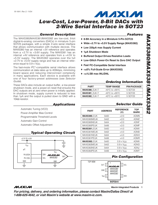 MAX5382 Low-Cost, Low-Power, 8-Bit DACs with 2-Wire Serial Interface in SOT23