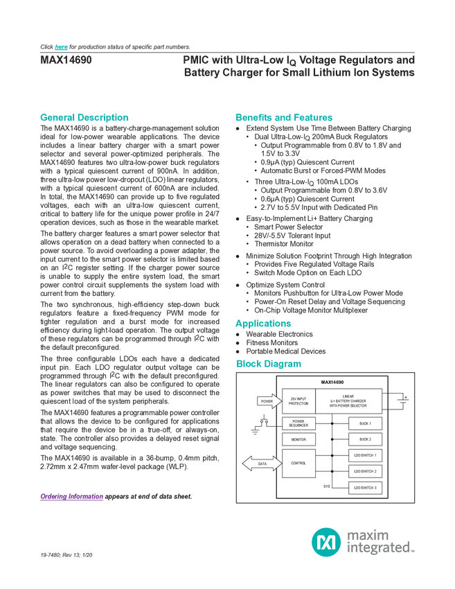 MAX14690 PMIC with Ultra-Low I Voltage Regulators and Battery Charger for Small Lith...
