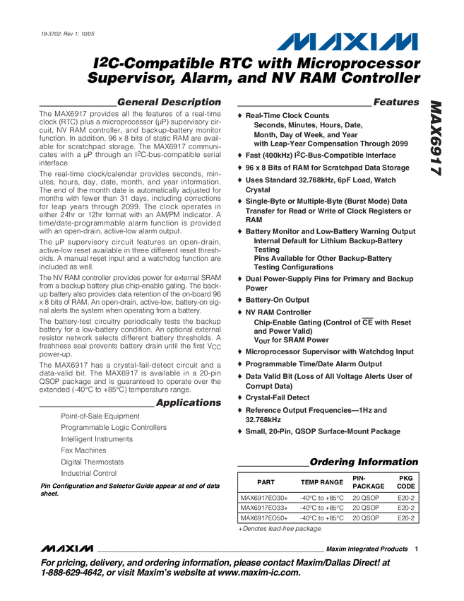 MAX6917 I²C-Compatible RTC with Microprocessor Supervisor, Alarm, and NV RAM Contro...