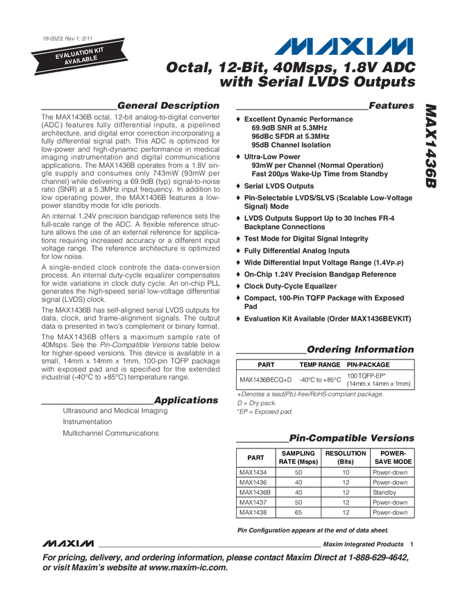 MAX1436B Octal, 12-Bit, 40Msps, 1.8V ADC with Serial LVDS Outputs