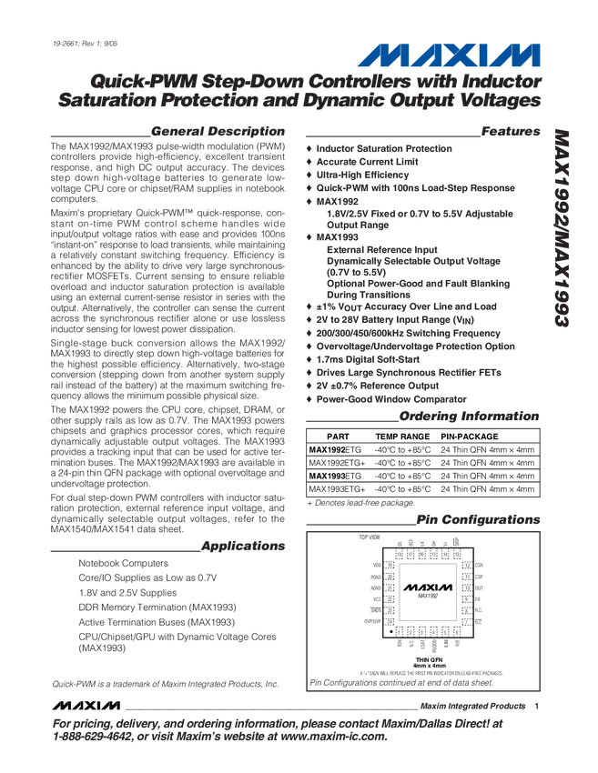 MAX1992 Quick-PWM Step-Down Controllers with Inductor Saturation Protection and Dyn...