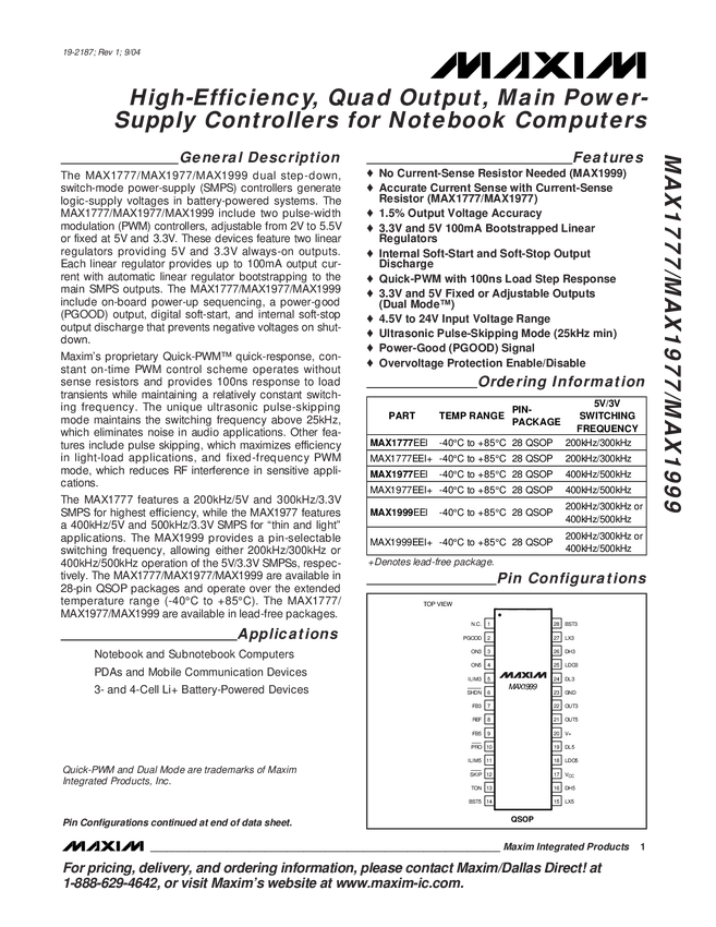 MAX1777 High-Efficiency, Quad Output, Main Power-Supply Controllers for Notebook Co...