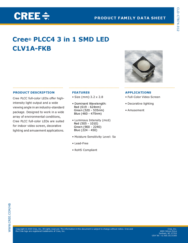 Dioda LED; CLV1A-FKB-MQH-B74; PLCC4; SMD; RGB Full Color; Red: 710-900mCd; 619-624nm; Green: 140-1800 mCd; 520-525nm; Blue 355-450 mCd; 465-470nm; 3×20mA, wspólna anoda; CREE; RoHS
