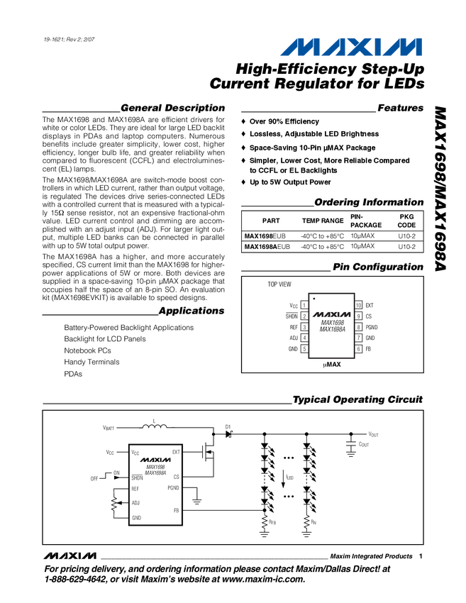MAX1698A High-Efficiency Step-Up Current Regulator for LEDs