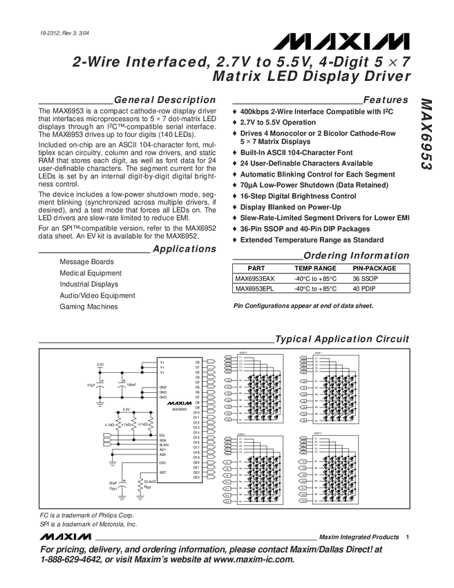 MAX6953 2-Wire Interfaced, 2.7V to 5.5V, 4-Digit 5 x 7 Matrix LED Display Driver