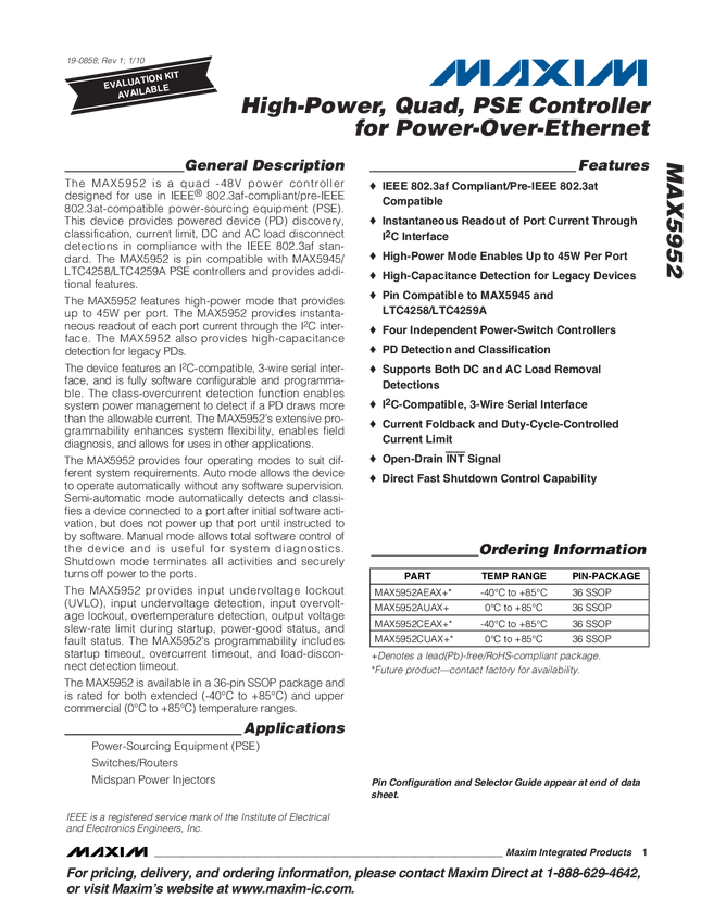 MAX5952 High-Power, Quad, PSE Controller for Power-Over-Ethernet