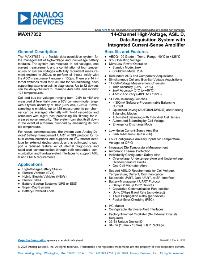 MAX17852 14-Channel High-Voltage, ASIL D, Data-Acquisition System with Integrated Cu...
