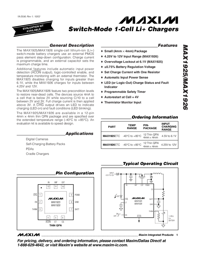 MAX1925 Switch-Mode 1-Cell Li+ Chargers