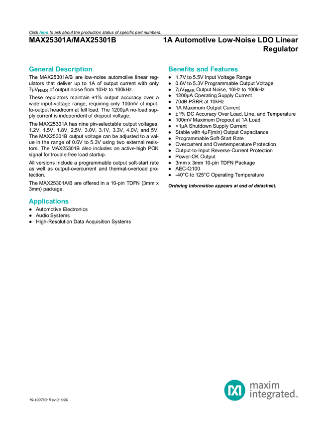 MAX25301B 1A Automotive Low-Noise LDO Linear Regulator
