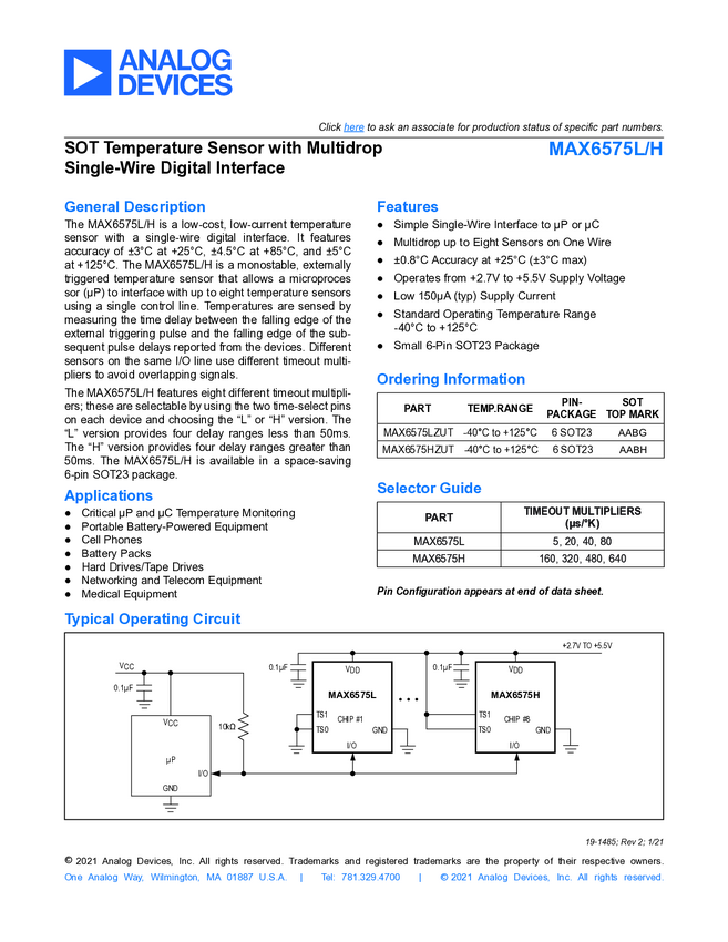 MAX6575L SOT Temperature Sensor with Multidrop Single Wire Digital Interface