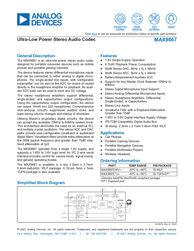 MAX9867 Ultra-Low Power Stereo Audio Codec