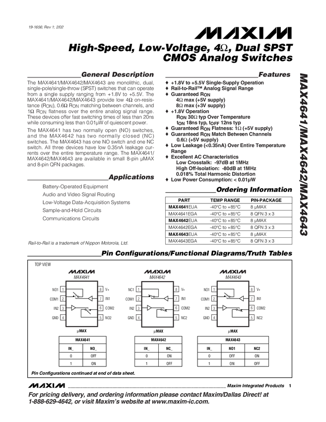 MAX4641 High-Speed, Low-Voltage, 4 Ohm, Dual SPST CMOS Analog Switches