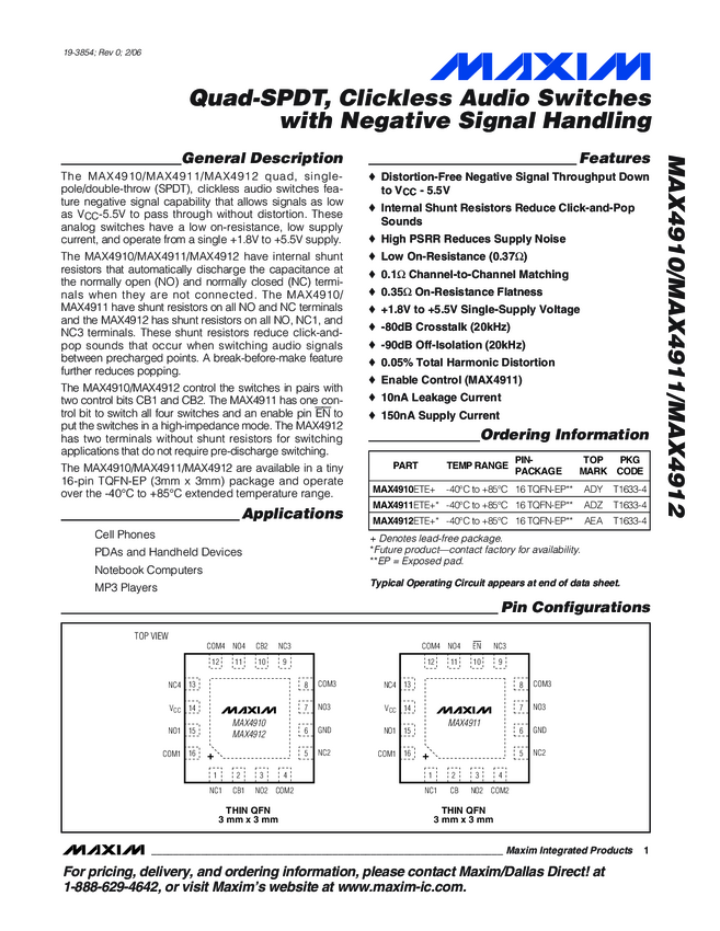 MAX4912 Quad-SPDT Clickless Audio Switches with Negative Signal Handling