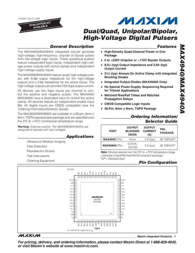 MAX4940 Dual/Quad, Unipolar/Bipolar, High-Voltage Digital Pulsers
