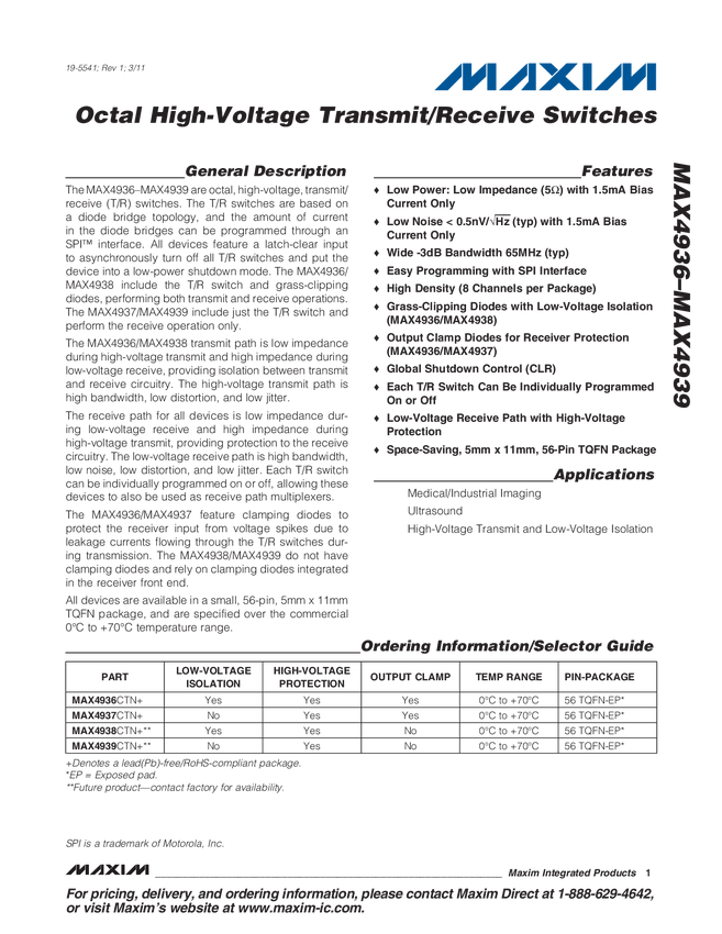 MAX4938 Octal High-Voltage Transmit/Receive Switches