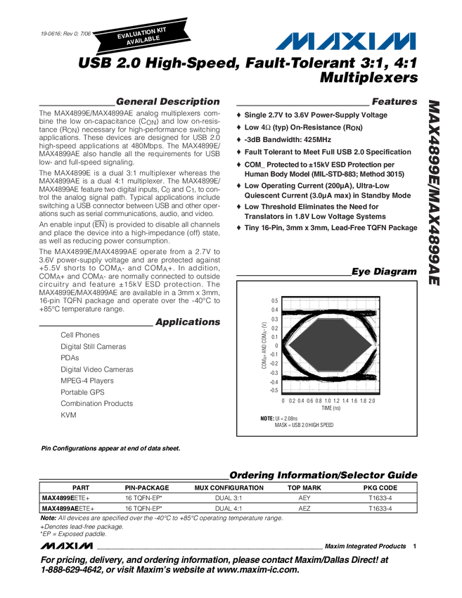 MAX4899AE USB 2.0 High-Speed, Fault-Tolerant 3:1, 4:1 Multiplexers