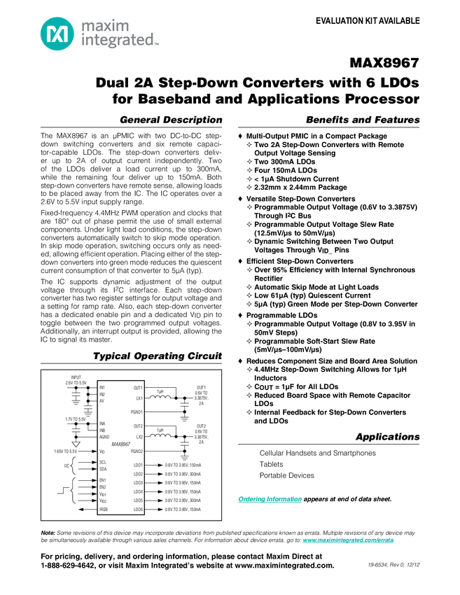 MAX8967 Dual Step-Down Converters with 6 LDOs for Baseband and Applications Process...