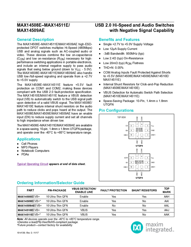 MAX14509E USB 2.0 Hi-Speed and Audio Switches with Negative Signal Capability