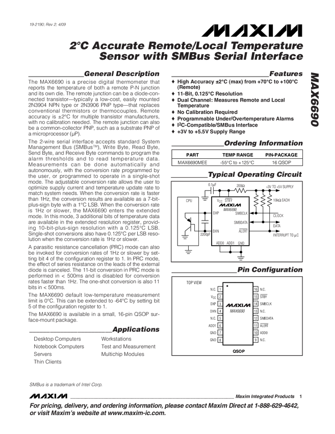 MAX6690 2°C Accurate Remote/Local Temperature Sensor with SMBus Serial Interface