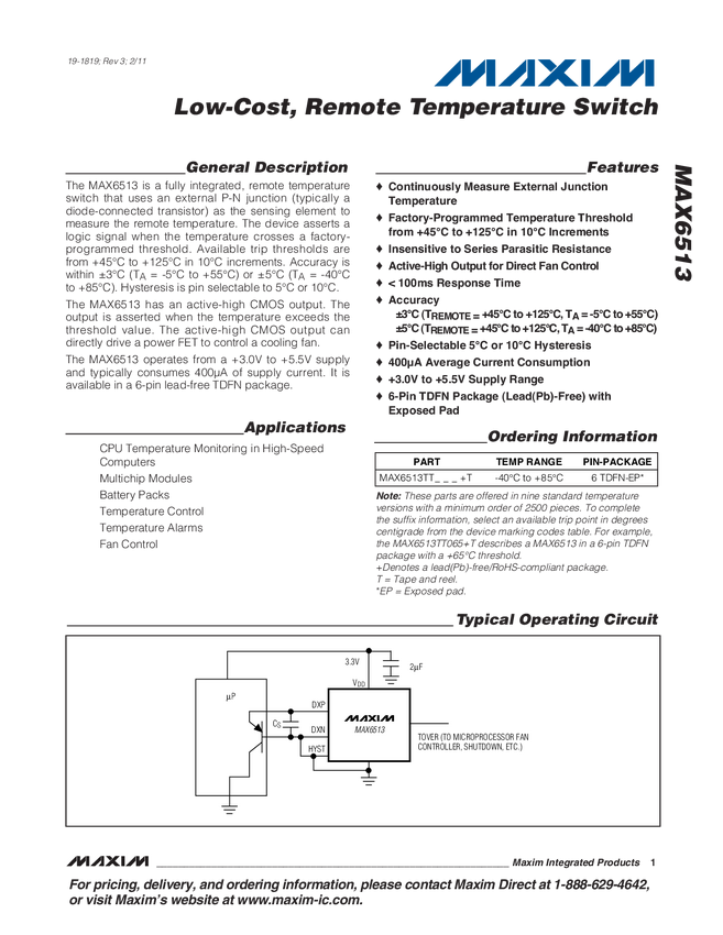 MAX6513 Low-Cost, Remote SOT Temperature Switch