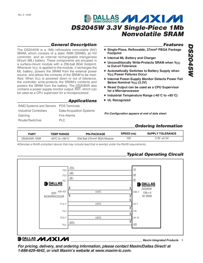 DS2045W 3.3V Single-Piece 1Mb Nonvolatile SRAM