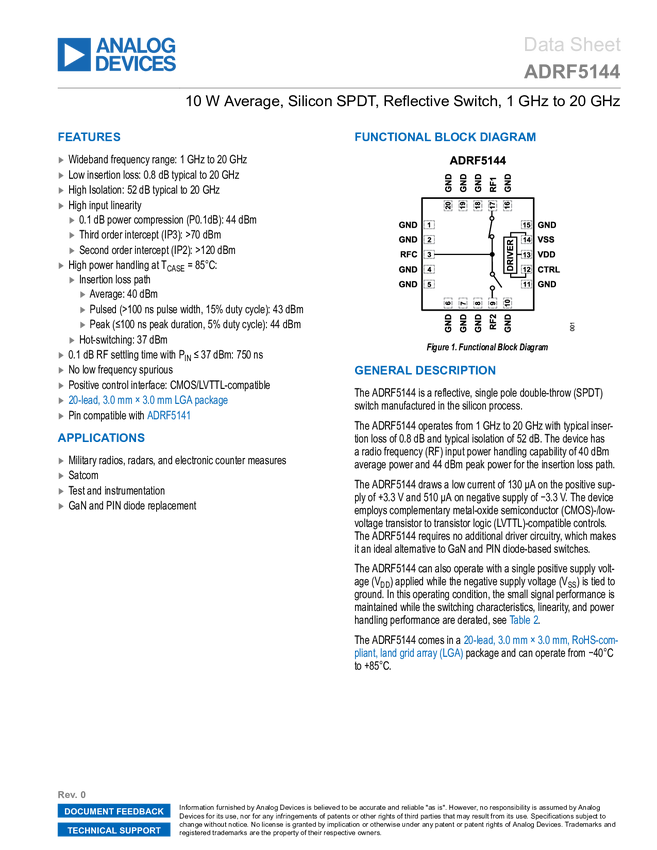 ADRF5144 10 W Average, Silicon SPDT, Reflective Switch, 1 GHz to 20 GHz