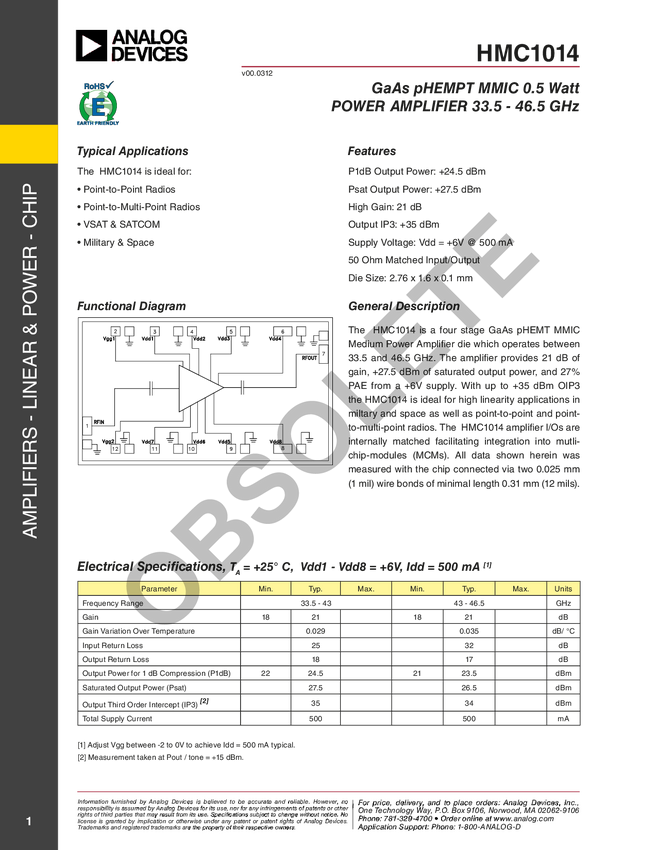 HMC1014 GaAs pHEMT MMIC 0.5 Watt Power Amplifier, 33.5 - 46.5 GHz