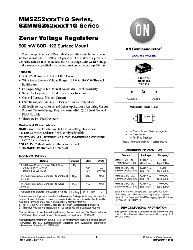 Dioda: Zenera; MMSZ5225BT1G; 0,5W; 3V; SOD123; SMD; ON SEMICONDUCTOR; RoHS; op/100szt