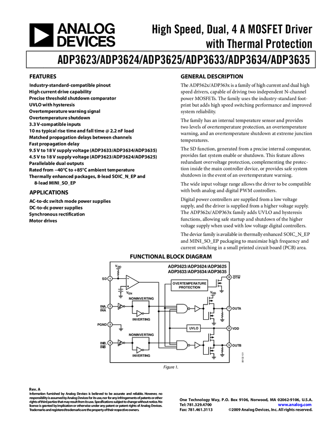 ADP3634 High Speed, Dual, 4 A MOSFET Driver, non-inverting A/B input pins, 4.5V < V...