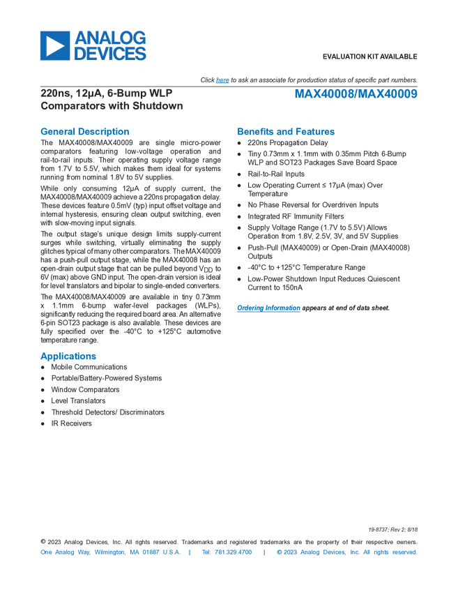 MAX40008 220ns, 12µA, 6-Bump WLP Comparators with Shutdown